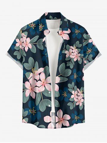 Plus Size Leaf Flower Branch Print Hawaii Button Pocket Shirt For Men - Cadetblue - 4xl