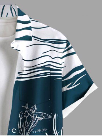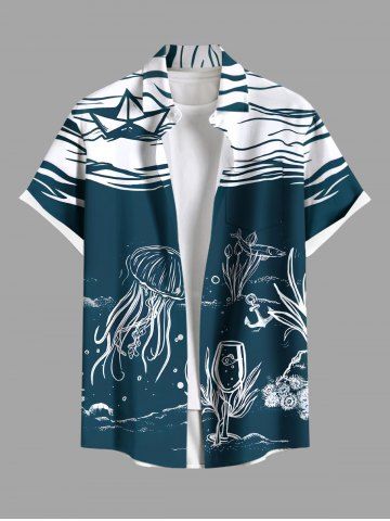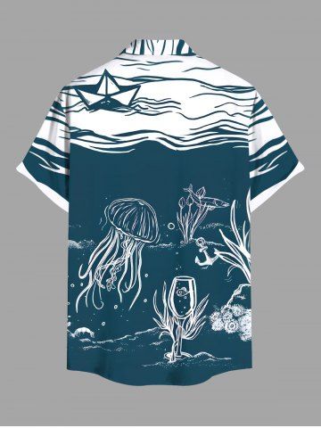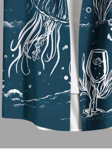 Plus Size Lellyfish Wine Glass Sailboat Sea Wave Print Hawaii Button Pocket Shirt For Men - Deep Green - M