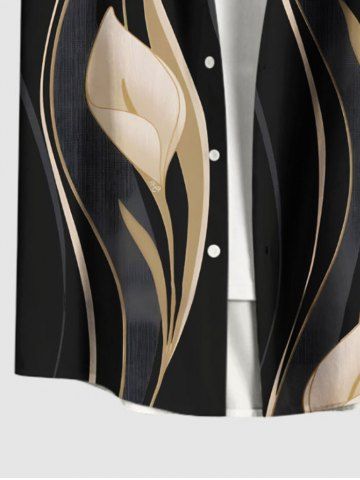 Plus Size Lily Flower Curve Print Hawaii Button Pocket Shirt For Men - Black - 2xl