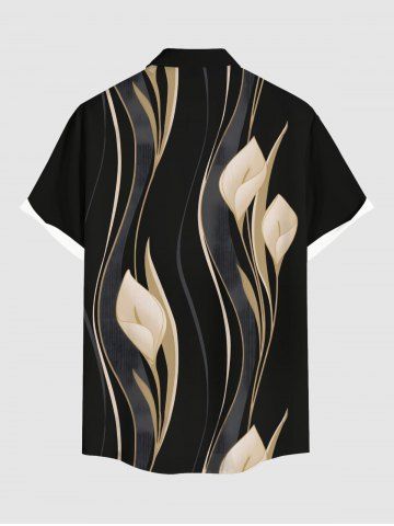 Plus Size Lily Flower Curve Print Hawaii Button Pocket Shirt For Men - Black - 4xl
