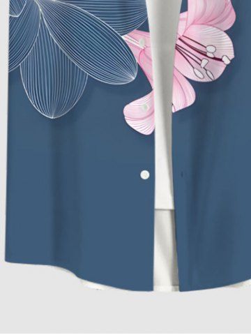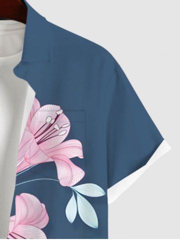 Plus Size Lily Flower Leaf Bird Print Hawaii Button Pocket Shirt For Men - Blue - L