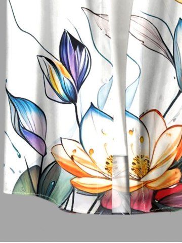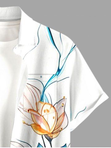 Plus Size Lotus Flower Leaf Print Hawaii Button Pocket Shirt For Men - White - 2xl