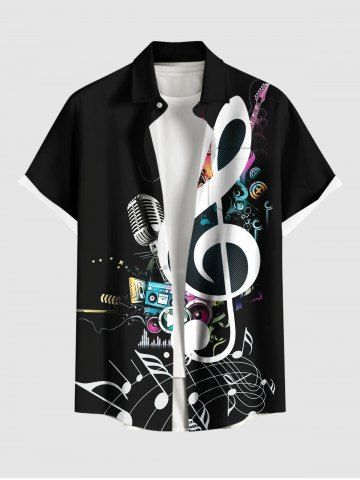 Plus Size Music Notes Radio Microphone Print Buttons Pocket Shirt For Men - Black - L