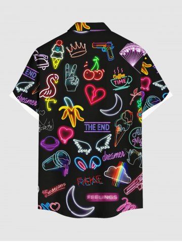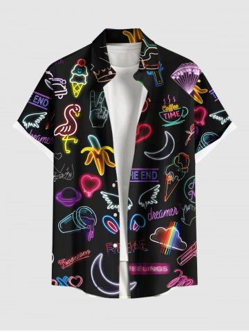 Plus Size Neon Flamingo Cherry Banana Heart Moon Wing Cloud Print Hawaii Button Pocket Shirt For Men - Black - S