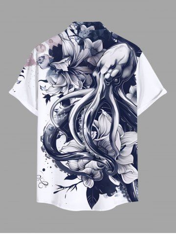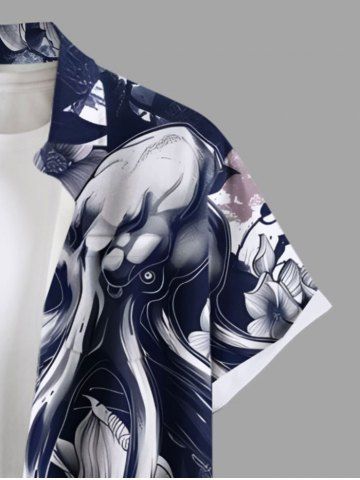 Plus Size Octopus Flower Leaf Watercolor Print Buttons Pocket Hawaii Shirt For Men - Deep Blue - 3xl