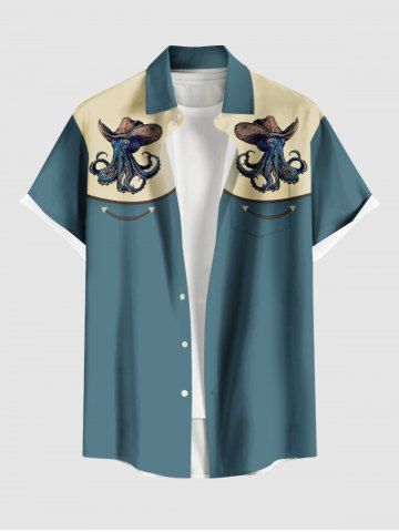 Plus Size Octopus Hat Colorblock Print Buttons Pocket Hawaii Shirt For Men - Dark Turquoise - Xl