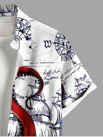 Plus Size Octopus Sailboat Print Hawaii Cruise Button Pocket Shirt For Men - White - S