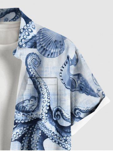 Plus Size Octopus Starfish Shell Crab Print Buttons Pocket Hawaii Shirt For Men - Blue - L