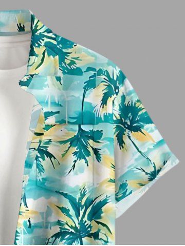 Plus Size Oil Painting Coconut Tree Print Buttons Pocket Hawaii Shirt For Men - Green - M