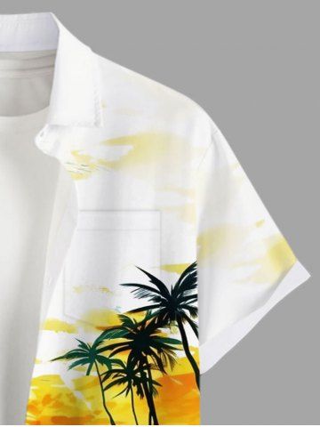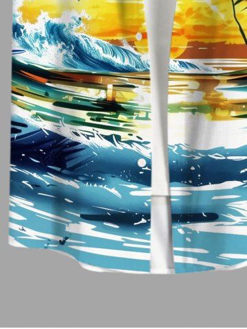 Short Sleeves Shirts > Plus Size Oil Painting Coconut Tree Sea Waves Sunset Print Buttons Pocket Hawaii Shirt For Men