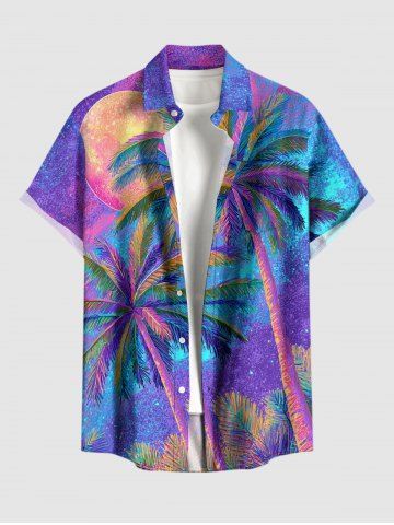 Plus Size Ombre Coconut Tree Moon Print Hawaii Button Pocket Shirt For Men - Light Purple - M