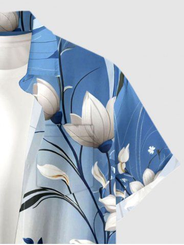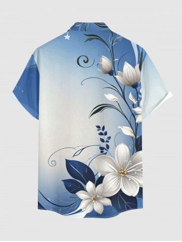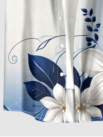 Plus Size Ombre Flower Leaf Branch Print Hawaii Button Pocket Shirt For Men - Blue - L