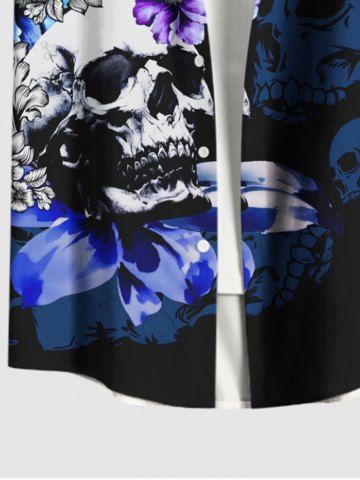 Plus Size Ombre Skull Flower Branch Print Hawaii Button Pocket Shirt For Men - Black - 4xl