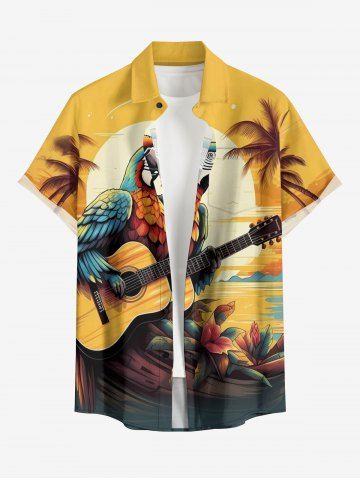 Plus Size Parrot Coconut Tree Flower Sun Seascape Print Buttons Pocket Hawaii Shirt For Men - Yellow - 5xl