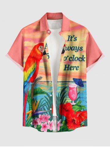 Plus Size Parrot Fruit Juice Hibiscus Flower Leaf Print Buttons Pocket Hawaii Shirt For Men - Pink - 2xl