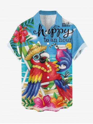 Plus Size Parrot Fruit Juice Hibiscus Flower Seascape Print Buttons Pocket Hawaii Shirt For Men - Blue - Xl