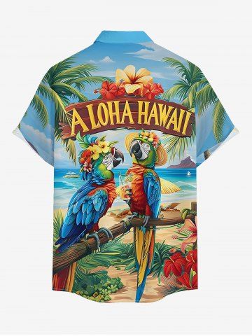 Plus Size Parrot Lovers Hibiscus Flowers Leaf Seascape Juice Print Buttons Pocket Hawaii Shirt For Men - Blue - 5xl