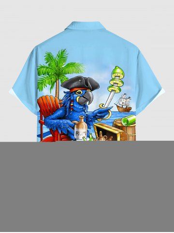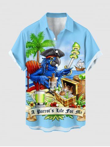 Plus Size Parrot Pirate Coconut Tree Fruit Juice Skull Flowers Print Buttons Pocket Hawaii Shirt For Men - Powder Blue - M
