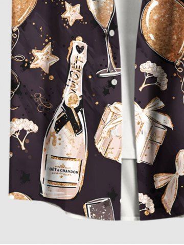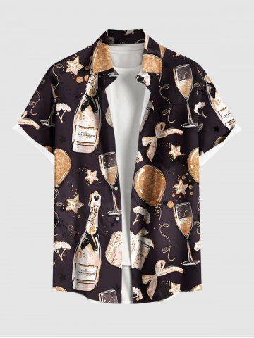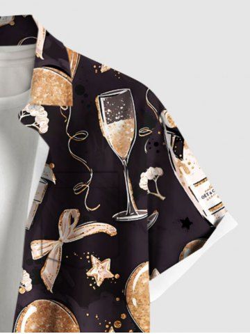 Plus Size Party New Years Eve Gift Balloon Bowknot Wine Print Button Pocket Shirt For Men - Black - Xl