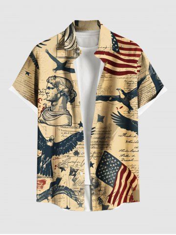 Short Sleeves Shirts > Plus Size Patriotic American Flag Eagle Sculpture Distressed Newspaper Print Button Pocket Shirt For Men