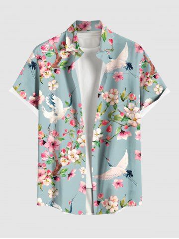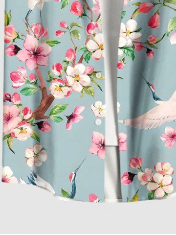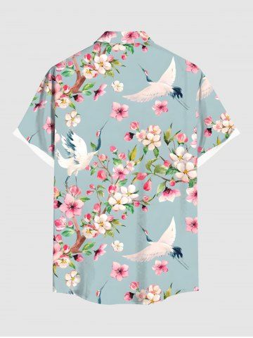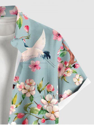 Plus Size Peach Blossom Floral Leaf Branch Crane Print Hawaii Button Pocket Shirt For Men - Light Blue - 2xl