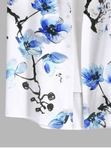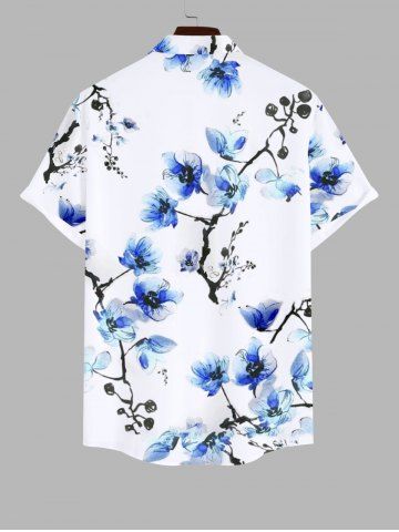 Plus Size Peach Blossom Flower Branch Watercolor Print Buttons Pocket Hawaii Shirt For Men - White - Xl