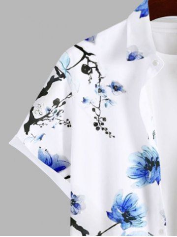 Plus Size Peach Blossom Flower Branch Watercolor Print Buttons Pocket Hawaii Shirt For Men - White - 2xl