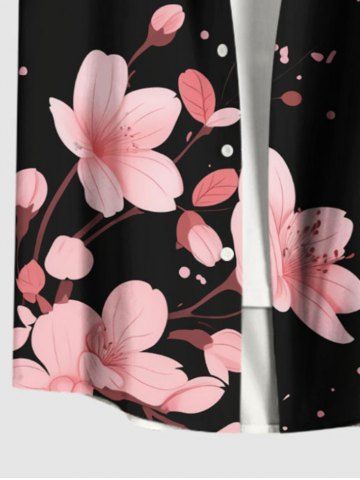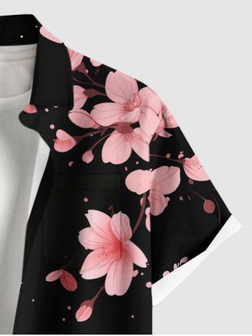 Plus Size Peach Blossom Petals Flower Print Hawaii Button Pocket Shirt For Men - Black - 2xl