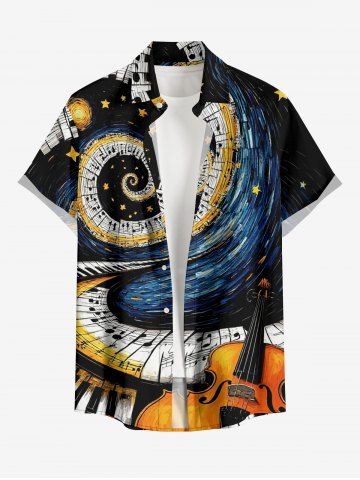 Plus Size Piano Music Symbol Spiral Galaxy Guitar Print Hawaii Button Pocket Shirt For Men - Black - M