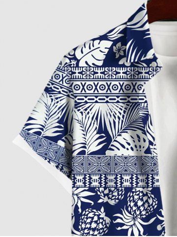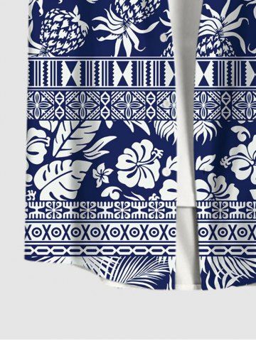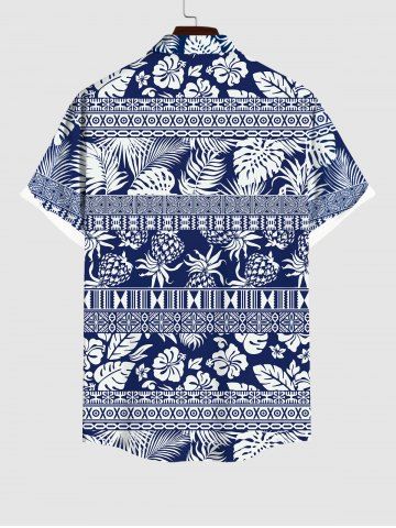 Plus Size Pineapple Floral Coconut Tree Striped Ethnic Graphic Print Button Pocket Hawaii Shirt For Men - Blue - L