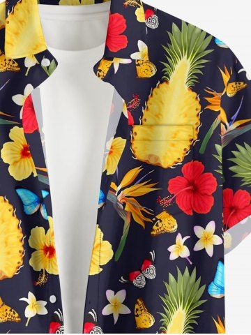 Short Sleeves Shirts > Plus Size Pineapple Hibiscus Flower Butterfly Print Hawaii Button Pocket Shirt For Men