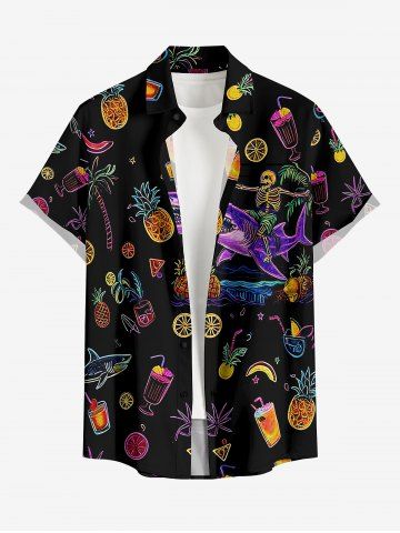 Plus Size Pineapple Skeleton Fruit Juice Coconut Tree Print Buttons Pocket Hawaii Shirt For Men - Black - 2xl