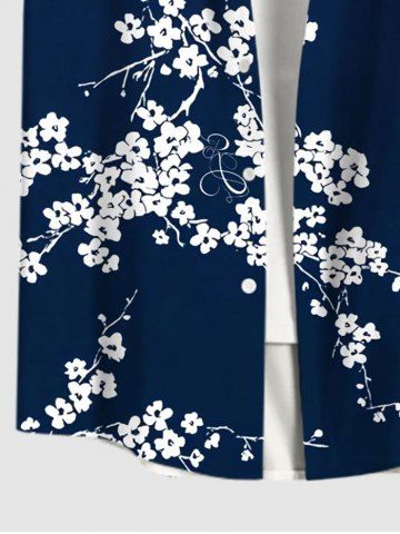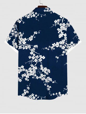 Plus Size Plum Bossom Flower Branch Print Buttons Pocket Shirt For Men - Midnight Blue - S