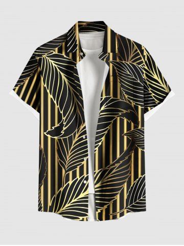 Plus Size Printed Metallic Leaf Stripes Print Buttons Pocket Hawaii Shirt For Men - Black - Xl