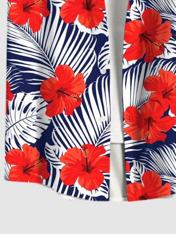 Short Sleeves Shirts > Plus Size Red Hibiscus Flower Tropical Palm Leaf Print Buttons Pocket Hawaii Shirt For Men