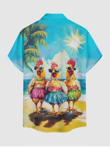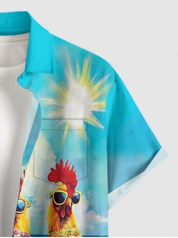 Plus Size Rooster Coconut Tree Sun Print Buttons Pocket Hawaii Shirt For Men - Sky Blue - M