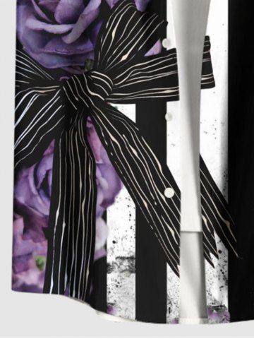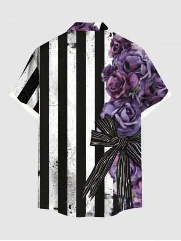 Plus Size Rose Flower Bowknot Ink Painting Zebra Striped Print Hawaii Button Pocket Shirt For Men - Purple - 4xl