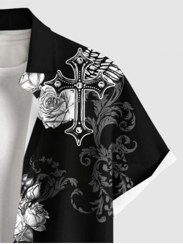 Short Sleeves Shirts > Plus Size Rose Flower Branch Cross Butterfly Print Button Pocket Shirt For Men