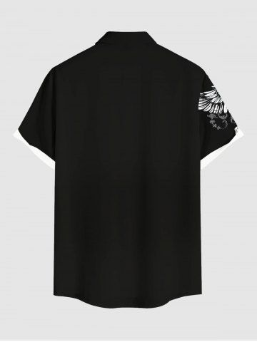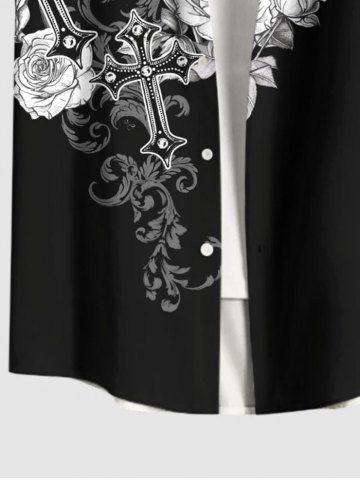 Plus Size Rose Flower Branch Cross Butterfly Print Button Pocket Shirt For Men - Black - 2xl