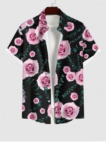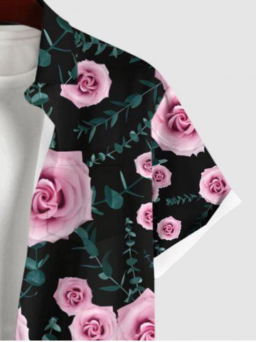 Short Sleeves Shirts > Plus Size Rose Flower Branch Leaf Print Hawaii Button Pocket Shirt For Men