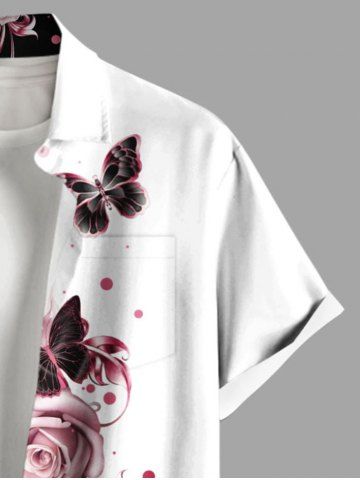 Short Sleeves Shirts > Plus Size Rose Flower Butterfly Curve Pin Dot Print Hawaii Button Pocket Shirt For Men