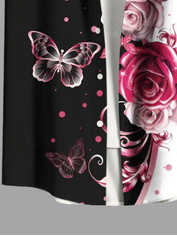 Plus Size Rose Flower Butterfly Curve Pin Dot Print Hawaii Button Pocket Shirt For Men - Black - L