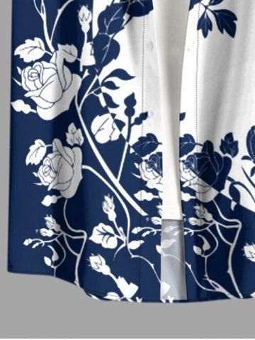 Plus Size Rose Flower Colorblock Print Buttons Pocket Hawaii Shirt For Men - Deep Blue - S