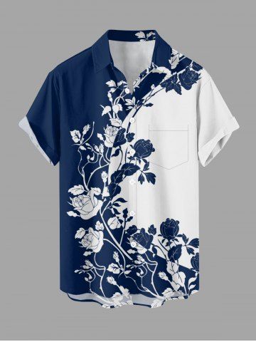 Plus Size Rose Flower Colorblock Print Buttons Pocket Hawaii Shirt For Men - Deep Blue - 3xl