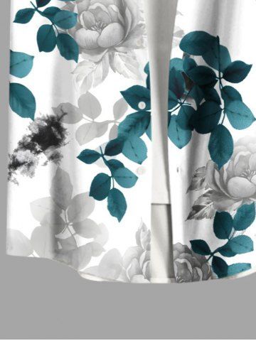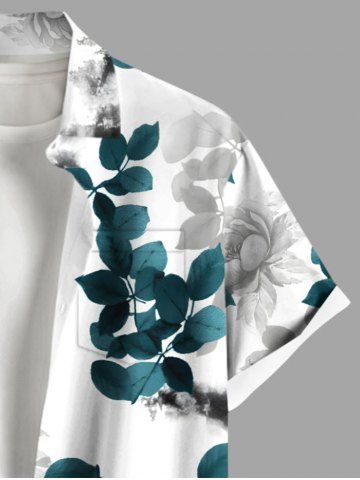 Plus Size Rose Flower Leaf Branch Print Hawaii Ombre Button Pocket Shirt For Men - White - 2xl