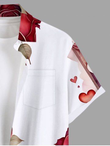 Short Sleeves Shirts > Plus Size Rose Flower Leaf Heart Print Valentines Hawaii Button Pocket Shirt For Men