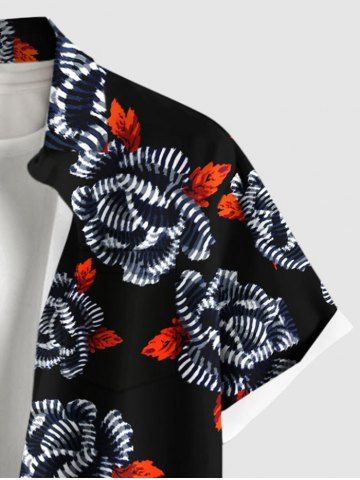 Plus Size Rose Flower Leaf Print Hawaii Button Pocket Shirt For Men - Black - Xl