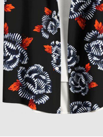 Plus Size Rose Flower Leaf Print Hawaii Button Pocket Shirt For Men - Black - 3xl