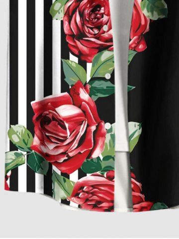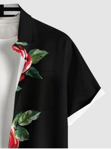 Plus Size Rose Flower Leaf Striped Print Hawaii Valentines Button Pocket Shirt For Men - Black - S