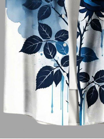 Plus Size Rose Flower Leaf Watercolor Print Buttons Pocket Shirt For Men - Blue - L